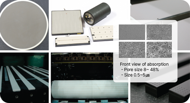 - It can be applied to Air Bearings, Ceramic Chucks and Air Floating Systems for FPD and Semiconductor by controlling Pore Size (1~20 ㎛) and Porosity (10~48%)
